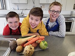 Holderbergschüler nehmen im „cleveren Esszimmer“ Platz. Die Initiative der Bahn-BKK setzt auf bewusste und gesunde Ernährung.