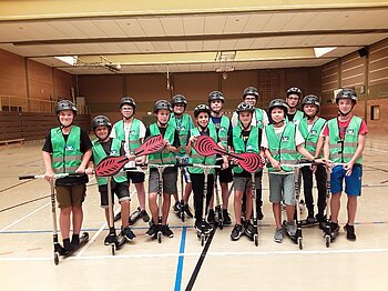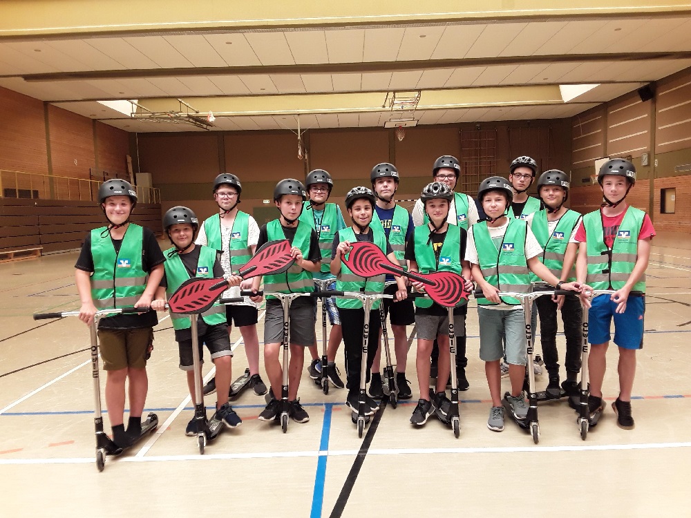 Hier stehen ihnen zahlreiche Funwheelgeräte zur Verfügung, die mit finanzieller Förderung der AOK und großer Unterstützung des schuleigenen Fördervereins im vergangenen Jahr angeschafft wurden. 25 Stuntroller sind neben den Waveboards die absoluten rollenden Renner.