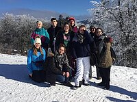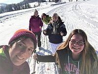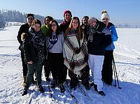 Nun zogen wir uns unsere wintertaugliche Kleidung an und nahmen uns Schlitten. Wir stiegen den steilen Berg mehrmals hinauf und fuhren wieder herunter. Die meisten hatten großen Spaß an den Aktivitäten. Nachdem wir den Berg erschöpft wieder herabgestiefelt waren, nahmen wir unsere Sachen und wir gingen in kleineren Gruppen entweder ins Restaurant oder Nachhause. Im Restaurant gab es viele Gerichte, die uns aus Deutschland bekannt waren, wie z.B. Pizza oder Pasta. So ließen wir alle individuell den Abend ausklingen.