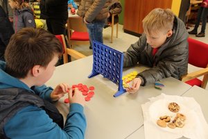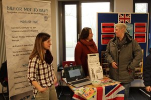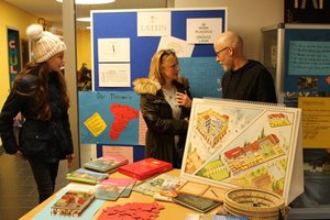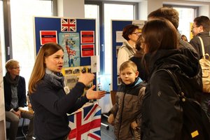 Am Stand des Fachbereichs Englisch wurden die Eltern über die vielfältigen, auch fächerübergreifenden Angebote des Fachbereichs informiert. Seit vielen Jahren wird bilingualer Unterricht ab der Klasse 7 im Gymnasial- und Realschulzweig angeboten. Dort werden die Fächer Biologie, Politik&Wirtschaft und Erdkunde auf Englisch, mit einer Zusatzstunde unterrichtet. Die Schüler gewöhnen sich schnell an den etwas anderen Unterricht. Und: es gibt nur positive Rückmeldungen von „Bili-Schülern“ in der Oberstufe. Ein Erfolgsmodell – ebenso wie die traditionellen, englisch-sprachigen Projekte in allen Jahrgangsstufen: Vorlesewettbewerb in Klasse 7, The Big Challenge (Klassen 5 – 8), der Fremdsprachenwettbewerb, das Auslandspraktikum in Norwich (beides Klasse 10) und das „English Summer Camp“ für Schüler ab der vierten Klasse. Die letzten beiden Angebote sind übrigens hessenweit einzigartig! Während sich die Eltern informierten, konnten sich die Kinder mit Sprachspielen und Quiz-Fragen beschäftigen.