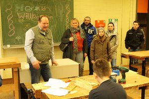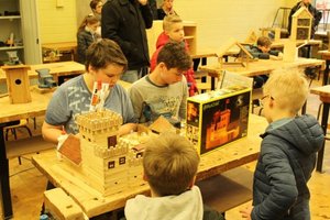 Im WP-Kurs „Holzbearbeitung“ fertigen die Siebtklässler sehr beeindruckende Holzbauten an. Diese wurden von den jungen Besuchern im Werkraum bestaunt. Aber die Jungen und Mädchen konnten sich vor Ort schon mal an einfachen Holzarbeiten versuchen. Karl-Friedrich Paul ist Lehrer und Schreinermeister. Davon profitieren die Kinder sehr!