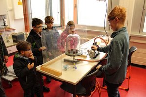 Unter dem Motto "Physik im Alltag" brachten Schülerinnen und Schülern der Klasse 7G1 den neuen Fünftklässlern das Fach Physik näher. Besonders beindruckt waren die jungen Besucher von der Vakuumglocke, unter der man Schokoküsse auf das vielfache ihres Ursprungsvolumens vergrößern konnte. Hmm, lecker! Auch wurden Erkenntnisse vermittelt über das Prinzip von Dynamos und Feuermeldern. An weiteren Stationen gab es Experiente zu Lichtwellenleitern und zur Photovoltaik.