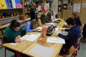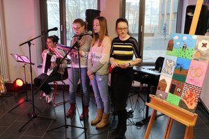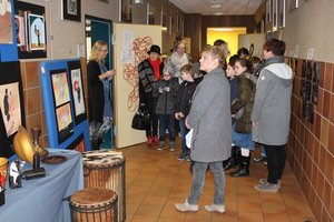 Vor und im Kunstraum stellte Stefanie Hausner Schülerarbeiten mit thematischen Schwerpunkten: „Japanische Kunst“, „Afrika“ und „Porträt“ aus. Auch ein Mitmachangebot gab es: Schüler der Kunst-AG und des WP-Kurses „Japanische Kunst“ führten die Besucher in die Kunst der Kalligraphie und der japanischen Schriftzeichen ein.