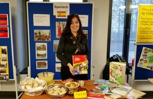 Spanisch gibt es an der Holderbergschule seit 10 Jahren als WP-Kurs, mit steigender Nachfrage! Sabine Schwehn informierte über die regelmäßigen Austauschfahrten zu der Partnerschule in Barcelona. Am Informationsstand wurden köstliche Tapas gereicht. Die Fotos auf der Infowand vermittelten Eindrücke über Kultur und Sprache und die Schüleraustauschfahrten, auf denen die Sprachkenntnisse vor Ort umsetzt werden konnten. Olè!