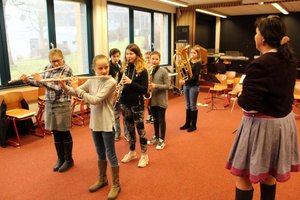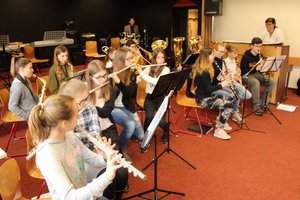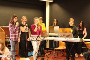 Der Fachbereich Musik sprühte mit Angeboten: So gab es offene Proben der Band- und Bläserklassen im Mehrzweckraum. Auch wurden die verschiedenen Aktionen der Musikklassen vorgestellt. Im B-Trakt wurden musikalische Beiträge von Schülerinnen und Schülern geboten: mit Gesang oder instrumental und dies aus verschiedenen Musik-Stilrichtungen. Die 10G1 trug beispielsweise ein humorvolles „Bänkellied“ vor - ein gemeinsames Projekt der Fächer Kunst, Deutsch und Musik. Ein Instrumentenworkshop durfte hier auch nicht fehlen: So konnten die Instrumente der Band- und Bläserklassen unter Anleitung fortgeschrittener Schüler ausprobiert werden. Auf den afrikanischen Trommeln des „Drum Circles“ erklangen exotische Rhythmen. Wer da nicht Lust bekam, sich für die Musikklasse anzumelden!