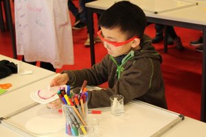 FB Chemie hatte sich für diesen Tag einige besondere Mitmachexperimente einfallen lassen, die bei den zukünftigen Holderbergschülern gut ankamen: Wer weiß schon, dass aus Gummibärchen richtiger Klebstoff hergestellt werden kann? Die angehenden, jungen Chemiker haben dies selbst ausprobiert. Außerdem „verzauberten“ sie im „Blue-Bottle-Versuch“ eine farblose Flüssigkeit durch Schüttlen in eine blaue Flüssigkeit! Auch die Eigenschaften von Currypulver waren ein Experiment wert: Statt gelb – wie zu erwarten wäre – wurde der Händeabdruck rot, weil die Hand vorher chemisch behandelt wurde. Die wissenschaftlichen Erklärungen erfolgen normalerweise im Chemieunterricht, wurden hier aber vor Ort gegeben.