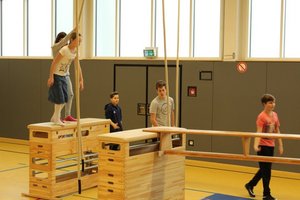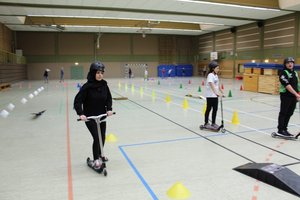 Bewegung wird groß geschrieben an der Holderbergschule. In der kleinen und großen Sporthalle tobten sich die jungen Besucher begeistert auf dem Geräteparcours aus, probierten die „Funwheel-Geräte“, die neuen Roller und Waveboards aus und machten erste Jonglier- Versuche sowie Fahrten auf dem Einrad. Unter fachkundiger Anleitung gab es so Einblicke in die motopädagogische Arbeit an der Holderbergschule sowie in den regulären Sportunterricht.