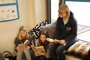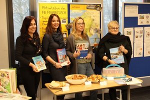 Passend zum Fach bot der Fachbereich Deutsch eine gemütliche Lese-Ecke für die jungen Besucher an. Dort lasen ältere Schülerinnen den jungen Besuchern aus ausgewählten Schullektüren vor. Auch ein Deutsch-Quiz war vorbereitet worden. Zudem wurden ausgewählte Schülerarbeiten ausgestellt (Comics, Lesetagebücher) und - als „Begrüßungsgeschenk“ für die neuen Fünftklässler: „Was wir euch zum Tag der offenen Tür mitgeben möchten“ – selbst verfasste Gedichte mit Bildern präsentiert. Ein besonderer Beitrag waren die kostümierten Aufführungen der bekannten Goethe-Ballade „der Erlkönig“.