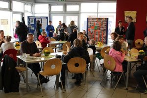 Gemütlicher Treffpunkt war die Mensa. Von hier aus starteten die Führungen durch das Schulgebäude im Viertelstundentakt von 9 bis 13 Uhr. Die Lehrkräfte der Holderbergschule informierten auf dem Rundweg über die Räumlichkeiten, führten die Besucher zu den Vorführungen in den verschiedenen Fachräumen und beantworteten sachkundig die Fragen der Eltern.