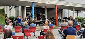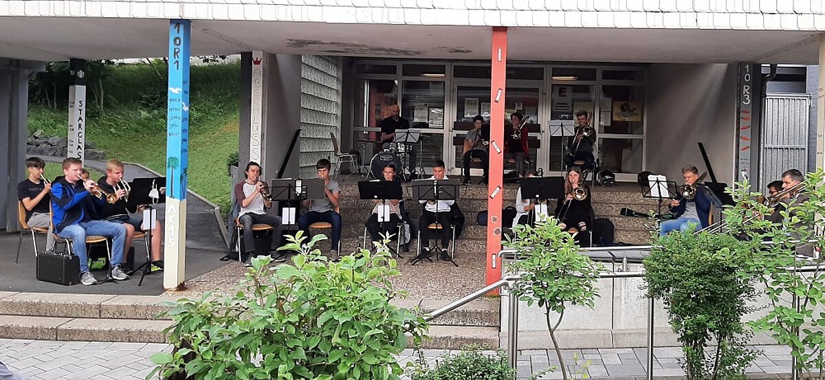 Am Freitag, dem 9. Juli, fand anlässlich des 20-jährigen Bestehens der Brassband der Holderbergschule ein Openair-Konzert auf dem Schulhof statt. Die Schulleiterin Andrea Rink begrüßte das Publikum und die Band mit den Worten: „Eigentlich habt ihr euch euer Jubiläum anders vorgestellt, mit allen Ehemaligen und eigentlich in der Kirche – aber immerhin ist es trocken und wir können uns an diesem kleinen Sommerkonzert heute Abend erfreuen.“ Sie dankte Gebhard Häußer für die 20-jährige Leitung der Brassband, die der Schule in diesen Jahren immer ein musikalisches Gesicht in der Öffentlichkeit verliehen habe. Die 15 Schülerinnen und Schüler begannen ihr Konzert mit "Hevenu Schalom Alechem", gefolgt von dem abwechslungsreichen Spielstück „Arioso“ und der Deutschen Nationalhymne. „Wenn auch nicht mehr für diese EM, so aber wenigstens für die nächste oder einfach die vielen deutschen Sportler bei Olympia“, kommentierte Gebhard Häußer. Es folgte ein buntes Programm aus Klassik, Märschen, Pop und Rock. Erstmals spielte die Brassband Ausschnitte aus der Filmmusik „Wallace&Gromit“, arrangiert vom Hirzenhainer Posaunenchorleiter Martin Eizenhöfer. In diesem Zusammenhang dankte Kristin Hermann allen Posaunenchören im Schuleinzugsgebiet, ohne deren Arbeit die Brassband nie so viele talentierte Musiker erhalten hätte. Nach einigen Spirituals wie: „Oh when the Saints“ und „Joshua fit the battle of Jericho“ übernahm Gebhard Häußer die Verabschiedung der Schulabgänger. Er bedankte sich bei Carolin Klein, Jana Philipp, Johannes Brandenburger, Silas Hofheinz und Tom Weinert für ihren jahrelangen Einsatz in der Brassband und überreichte ihnen unter dem Applaus des Publikums Urkunden. Diese enthielten unter anderem gemeinsame Erlebnisse der letzten Jahre, in Bildern festgehalten. Die Brassband verabschiedete ihr Publikum mit „Highland Cathedral“, eines der "best off" der letzten 20 Jahre und der Ankündigung das große Jubiläumskonzert so bald als pandemiebedingt möglich nachzuholen.