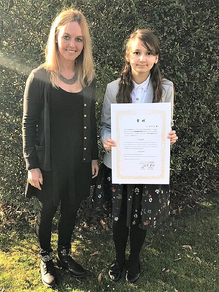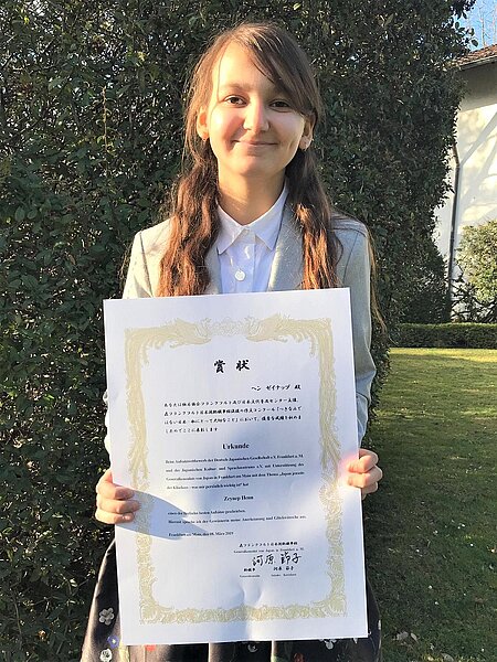 Zeynep Henn aus der 6R1 wurde als eine der 15 Finalisten ermittelt. Sie fuhr am 8. März mit ihrer Klassenlehrerin und Japan-Koordinatorin Jessica Tirjan nach Frankfurt zur Preisverleihung, in die Residenz der japanischen Generalkonsulin. Zeynep war die mit Abstand jüngste Finalistin und ihre herausragenden Leistungen wurden von Stefan Zeidenitz,
