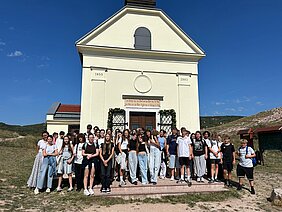 In der letzten Septemberwoche besuchten 10 Schülerinnen und 8 Schüler der Holderbergschule als Gegenbesuch die BUDAÖRSI SZÁMÚ ÁLTALÁNOS ISKOLA im ungarischen Budaörs für sechs Tage. Die Anreise erfolgte mit dem Zug über Wien, verbunden mit einer kurzen Stadterkundung. Der Austausch mit der Schule in Budaörs, eine ehemalige schwabendeutsche Siedlung, besteht seit nunmehr acht Jahren. Thematisch stand das diesjährige Projekt unter dem Motto "Nachhaltigkeit". Vor Ort wurden somit verschiedene kreative Aufgaben themenbezogen behandelt: ein Baum aus Händen mit Aspekten zur Nachhaltigkeit entstand, Papierreste wurden zur Nachbildung berühmter Kunstwerke gestaltet und Müll zu neuen Produkten umgearbeitet. Die Jugendlichen besuchten selbstverständlich auch den Unterricht ihrer Austauschpartner und konnten sich so ein Bild vom ungarischen Schulalltag bilden. Gemeinsam mit den ungarischen Gastgebern wurde am letzten Tag noch der europäische Sprachentag gefeiert. Sportlich messen konnten sich beide Gruppen beim deutsch-ungarischen Sportwettkampf, wobei der Spaßfaktor im Zentrum stand.