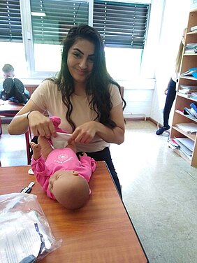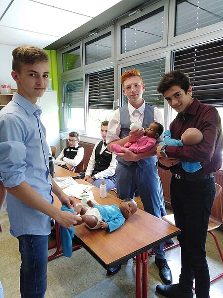 Dass Babypflege nicht nur Frauensache ist, bewiesen die Jungs der Klasse, indem sie sich ebenso verantwortungsbewusst um die Säuglinge kümmerten wie die Mädchen. Bei der Auswertung der Computerchips im Babysimulator konnte man danach feststellen, wie gut sich die Jungen im „ihr“ Baby gekümmert hatten. Dabei wurden auch Gefahren wie das lebensbedrohliche Schütteln oder ein eventueller zu grober Umgang mit den Babys thematisiert.