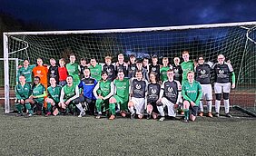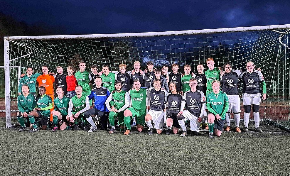 Kurz vor den Osterferien veranstaltete die Holderbergschule zusammen mit dem ortsansässigen Fußballverein ein Benefiz-Spiel im Holderbergstadion. Es spielten die Mannschaften der SG Eschenburg II zusammen mit den Eschenburg Damen gegen die Holderbergschule "Allstars", ein Team bestehend aus Schülerinnen und Schülern sowie Lehrerinnen und Lehrern. Obwohl das Wetter an diesem Tag wechselhaft war, fanden ca. 200 Zuschauerinnen und Zuschauer den Weg ins Stadion, wo sie mit Würstchen im Brötchen, Pizza vom Pizza- und Kebab-Restaurant Güven und mit Getränken versorgt wurden. Pünktlich zum Anpfiff von Schiedsrichter Paul Schmitt (Klasse 7G2) verschwanden dann auch die letzten Regenwolken und die Sonne kam sogar zum Vorschein. Das Fußballspiel mit dem Endstand 5:3 für die SGE, verlief fair, verletzungsfrei und bereitete allen Beteiligten viel Freude.