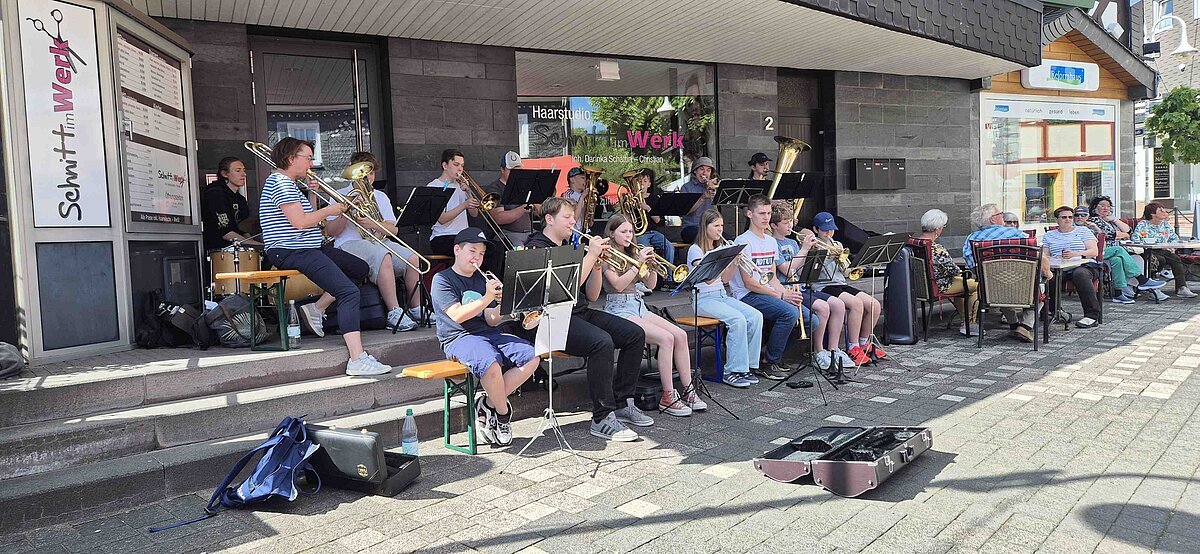 Jedes Jahr besucht die Brassband der Holderbergschule eine hessische Stadt und gibt dort ein bis zwei Konzerte. In diesem Jahr ging es ausnahmsweise in eine Stadt in Rheinland Pfalz. Am diesjährigen Muttertag, 11. Mai, reiste die Brass Band unter der Leitung von Gebhard Häußer und Kristin Hermann zum Stadtfest (mit Oltimerausstellung) nach Bad Marienberg und erfreute dort das Publikum mit einem einstündigen Konzert in der Fußgängerzone. Das 16-köpfige Ensemble spielte insgesamt 14 Stücke - ein Mix aus klassischer und moderner Musik, darunter Marsch- und Filmmusik. Zwei Stücke wurden erstmalig von den neuen Schlagzeugern Josias Riedel und Ben Haffer begleitet. Zu den Highlights gehörten „King of the road“ - bei dem die Zuhörer mitschnippsten - und Blue Sky - passend zum strahlenden Sonnenschein. Vorab stellten die Musikgruppe und teilweise auch die begleitenden Eltern drei Stunden im Kletterwald Bad Marienberg ihre Kletterkünste unter Beweis. Sogar die „Eiger Nordwand“ (eine schwarze Kletterroute) wurde von mehr als der Hälfte der Kletterer bezwungen.