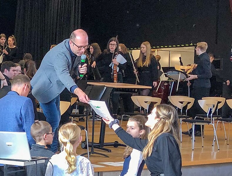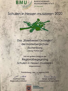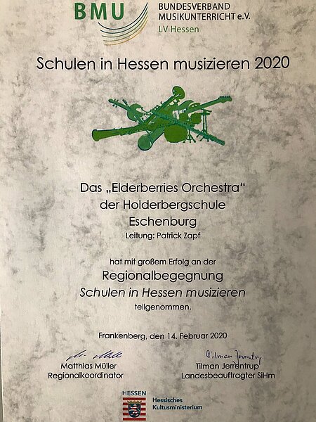 Dort präsentierten 13 Ensembles ein hervorragendes Programm unterschiedlichster Couleur. Neben Big Bands und Orchestern nahm in diesem Jahr auch die Holderbergschule mit dem „Elderberries Orchestra“ an der Veranstaltung teil. Unter der Leitung von Patrick Zapf warteten die Musikerinnen und Musiker der Holderbergschule mit drei Stücken auf. Zur Eröffnung wurde das Stück „An guten Tagen“ (Johannes Oerding) dargeboten. Danach folgten die Songs „Say You Won’t Let Go“ (James Arthur) und der Titel „Fire On Fire“ (Sam Smith). Die Besonderheit des Ensembles liegt zum einen in der untypischen Besetzung und zum anderen darin, dass alle Songs von den Jugendlichen selbst ausgesucht und dann gemeinsam im Unterricht arrangiert werden. Die Musikerinnen und Musiker präsentierten die Stücke hervorragend und ernteten viel Applaus. Das Ensemble bedankt sich aber vor allem bei dem Förderverein der Holderbergschule, ohne dessen Subvention der Fahrtkosten die Teilnahme nicht möglich gewesen wäre.