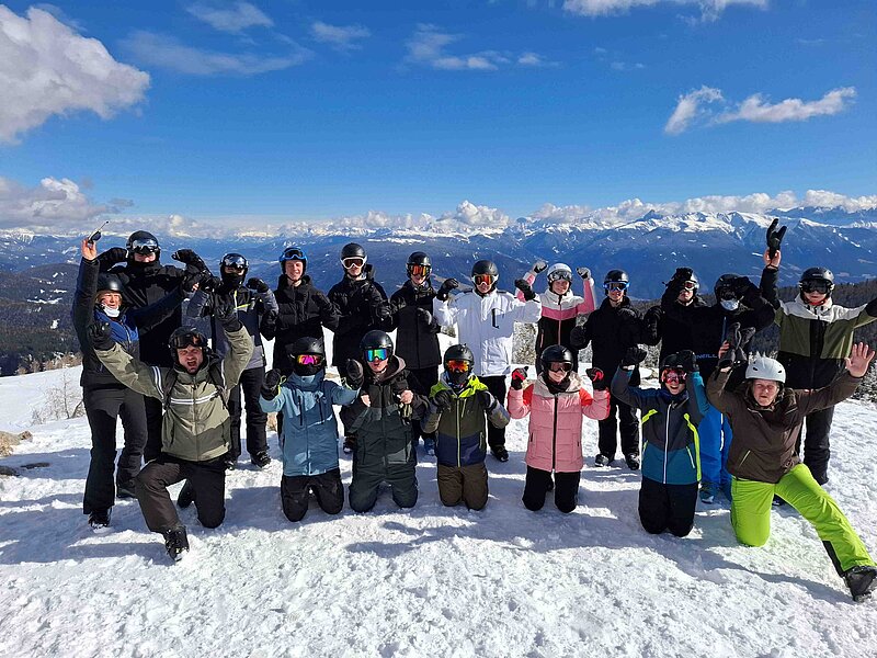 Der Großteil der Gruppe hatte auf der Fahrt zum ersten Mal die Gelegenheit, auf Brettern die verschneiten Alpen zu erleben. Einige standen in Südtirol zum ersten Mal auf den Skiern. Angeleitet von einem skierfahrenen Team aus aktuellen und ehemaligen Lehrkräften der Holderbergschule konnten schnell Lernerfolge erzielt werden. Bei den Anfängerinnen und Anfängern stand zunächst die Pflugtechnik und damit das sicherer Bremsen und Kurvenfahren auf dem Programm. Im Laufe der Woche gingen die Pflugfahrten dann immer mehr ins Fahren mit paralleler Skiführung über. Die Fortgeschrittenen feilten derweil an ihrer Technik. Neben einer guten Fahrposition, wurden vor allem der bewusste Belastungswechsel vor dem Einfahren in die nächste Kurve und der langgezogene Kanteneinsatz bei Carvingschwüngen trainiert.