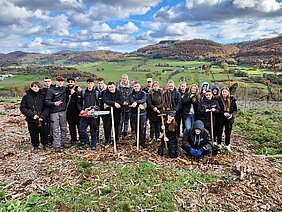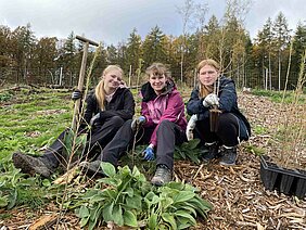 Die Älteren hingegen, die 10G und die 10R2 mit ihren Klassenlehrern Michael Behnke und Thomas Giersbach, rückten nun aus, um die Wiederaufforstung tatkräftig zu unterstützen. Es galt Douglasien, Lärchen und Bronzebirken zu pflanzen, Baumarten, die mit steigenden Temperaturen und Wassermangel besser zurechtkommen. Gerade die Bronzebirke wird in der mitteleuropäischen Forstwirtschaft als gute Alternative im Klimawandel angesehen. Doch bevor es ans Werk ging, erklärte Forstwirt Niels Bender den Schülerinnen und Schülern genau das Pflanzverfahren. Auf der ½ Hektar großen, bereits gemulchten und eingezäunten Fläche oberhalb von Eibelshausen sollten die Containerpflanzen an den bereits markierten Stellen gesetzt werden - schließlich muss ein gewisser Pflanzverband gewährleistet sein. Denn nur dann ist bei später folgenden Kulturpflegemaßnahmen die schneller wachsende Begleitvegetation - wie Ginster, Holunder oder Brombeere - besser im Zaum zu halten und den Jungpflanzen ist ein gutes Wachstum möglich. „Dann entfernt ihr als erstes die Mulchauflage, damit der Mulch nicht im Pflanzloch verrottet. Denn dadurch könnten sich Hohlräume bilden, die die Wurzelausprägung und die Wasseraufnahme der jungen Pflanzen verhindern könnten. Das Pflanzloch selbst stecht ihr mit dem Hohlspaten in dem eben demonstrierten Verfahren mit zwei Spatenstichen nicht zu tief, nur so tief, dass die Containerpflanze exakt hineinpasst. Anschließend richtig fest antreten und fertig“.