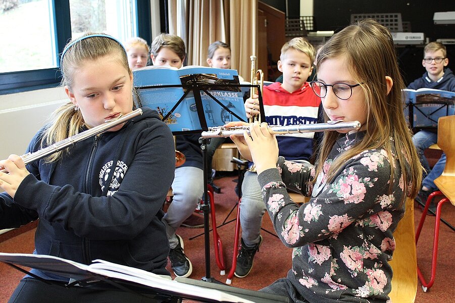 Eine Liveprobe der Bläser- und Bandklassen gab es im Musikraum, aber es konnten auch verschiedene Musikinstrumente selbst ausprobiert werden, angeleitet durch junge Musiker der 5. und 6. Klassen.
