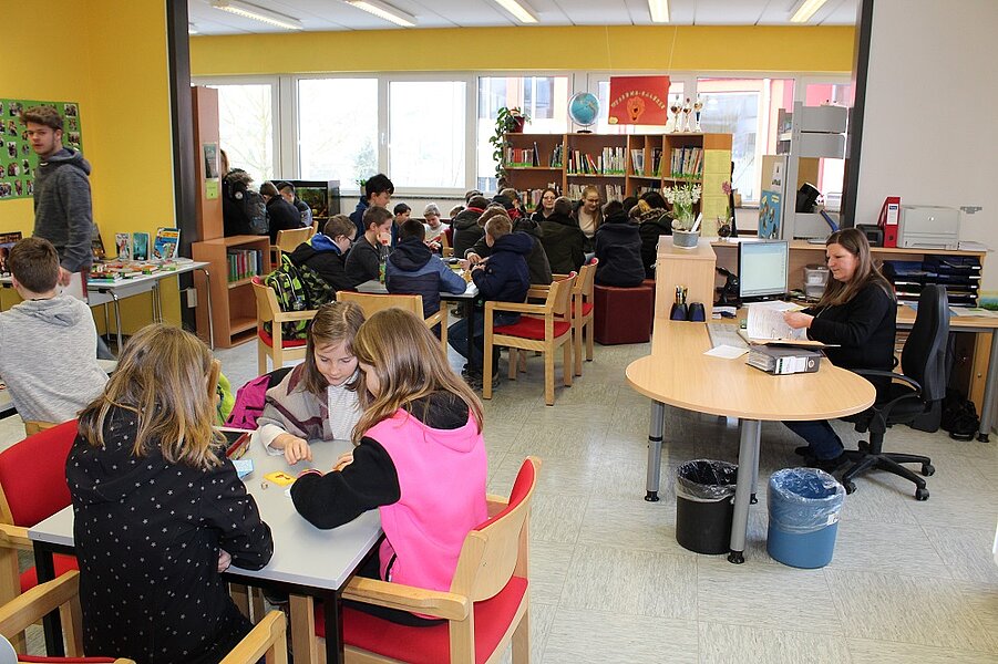 Die Schulbibliothek ist ein beliebter und belebter Ort unserer Schule. Hier wird täglich recherchiert und gearbeitet, sei es im Hinblick auf den Unterricht, zur Vorbereitung von Referaten und Präsentationen oder als Vorarbeit für die Hausaufgaben. Die Bibliothek verfügt über Arbeitsplätze für eine komplette Klasse sowie zahlreiche Computerarbeitsplätze, die von allen Schüler*innen genutzt werden können. So ist ein aktives und zeitgemäßes Arbeiten möglich.