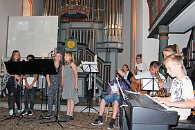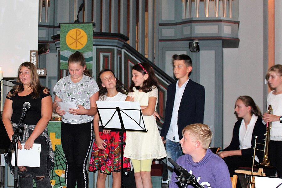 Die Mehrheit der neuen Fünftklässler nahm mit ihrer Familie an diesem Abendgottesdienst teil. Gestaltet wurde dieser von den jetzigen sechsten Klassen. Die 6G1 hatte vier gemeinsame Lieder einstudiert; Schüler der 6R2 lasen den Psalm 23 in moderner Fassung vor und die 6R1 präsentierte eine Sprechmotette zum Thema „Vertrauen beim Hochseiltanz". Die Fürbitten wurden von der 6H vorbereitet und für das Segensgebet war die Religionsgruppe von Frau Becker zuständig. Den krönenden Abschluss bildeten die Schüler der 6R3 mit selbst gebastelten Schirmchen, die jeder neue Schüler zur Erinnerung an das Bild: „Gott ist wie ein Schirm" als Geschenk mitnehmen durfte. Die Brassband, unter der Leitung von Gebhard Häußer, begleitete den Gottesdienst mit gelungenen, instrumentalen Darbietungen.