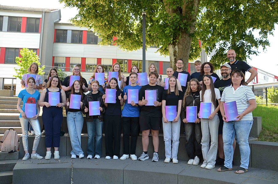 Im Schuljahr 2024/25 hatten insgesamt 21 Schülerinnen und Schüler die Möglichkeit im Rahmen einer Erasmus+ Mobiliätsaktivität mit Ungarn beziehungsweise während eines zweiwöchigen Auslandspraktikums in Irland einen Europass-Mobilitätsnachweis der Europäischen Union zu erwerben. Dieser wurde von der Projektkoordinatorin Karina Radünz um Aktivitäten und neu erworbene Kompetenzen ergänzt und gemeinsam mit dem Schulleiter Patrick Zapf nun zum Ende des Schuljahres an die Schülerinnen und Schüler verliehen. Zudem erhielten auch 5 Lehrerinnen und Lehrer der Holderbergschule einen Europass-Mobilitätsnachweis, die im laufenden Schuljahr an Fortbildungen und Hospitationen an europäischen Schulen im Rahmen von Erasmus+ teilgenommen hatten. Im Europass werden die Kompetenzen und Lernerfahrungen der einzelnen Personen im Rahmen der Mobilität dokumentiert und ihre Tätigkeit im Rahmen des Projektes honoriert. Für Schülerinnen und Schüler ist der Europass zudem ein wichtiger Qualifikationsnachweis auf dem Weg in die Berufswelt. Das Projekt wird durch die Europäische Union finanziert.
