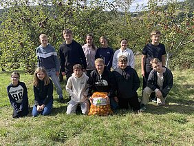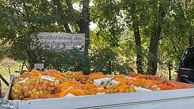 Auch in diesem Herbst ernteten wieder über 100 Schülerinnen und Schüler unter der Aufsicht von Markus Schmidt die Äpfel auf der Streuobstwiese und konnten mit 1220 Liter Apfelsaft wieder eine sehr gute Ernte einfahren. Der Apfelsaft wurde gepresst und in Kartons à 3-Liter, 5-Liter- und 10-Liter abgefüllt werden.