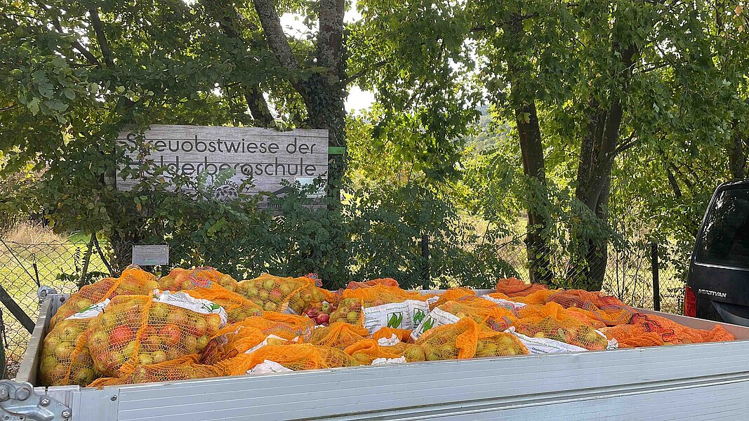 Das frostige Frühjahr des letzten Jahres hatte einen großen Einfluss auf die 1 Hektar große Streuobstwiese der Holderbergschule und der Ertrag war im Vorjahr wesentlich geringer ausgefallen als in den Jahren davor. In diesem Jahr hingen die Bäume jedoch so voller Äpfel, dass reihenweise Äste abknickten und die Schülerinnen und Schüler es zeitlich nicht schaffen konnten, die gesamte Menge an vorhandenen Äpfeln zu nutzen.