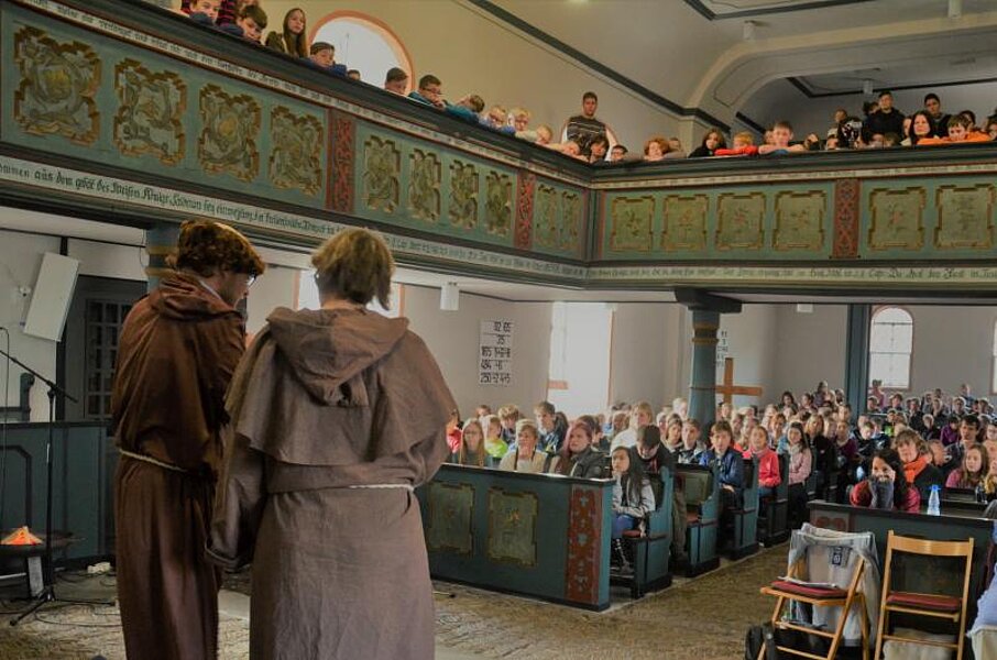 Im Mittelpunkt der Gottesdienste stand ein Theaterstück, das die wichtigsten Momente in Luthers Leben und vor allem seine reformatorischen Gedanken lebendig darstellte. Die Rollen wurden überzeugend von den Religionslehrerinnen und Religionslehrern gespielt.