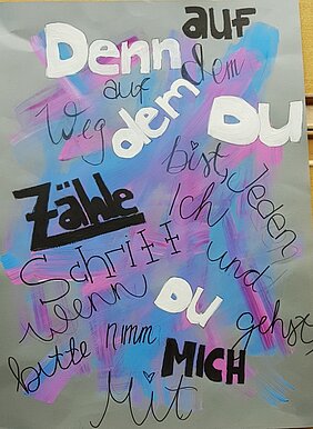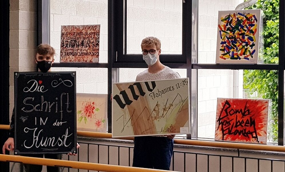 Basierend auf diesem Hintergrundwissen wurden kreative Aufgabenstellungen zu den Themenschwerpunkten Kalligrafie, Handlettering und expressive Bildgestaltung bearbeitet. Es entstanden ausdrucksstarke, oft farbenfrohe und großformatige Kunstwerke. Eine Auswahl dieser Arbeiten sind ab sofort bis ca. Ende August im Rathaus Eibelshausen zu besichtigen.