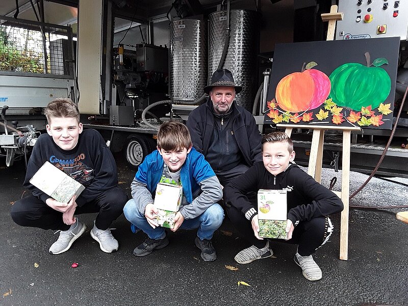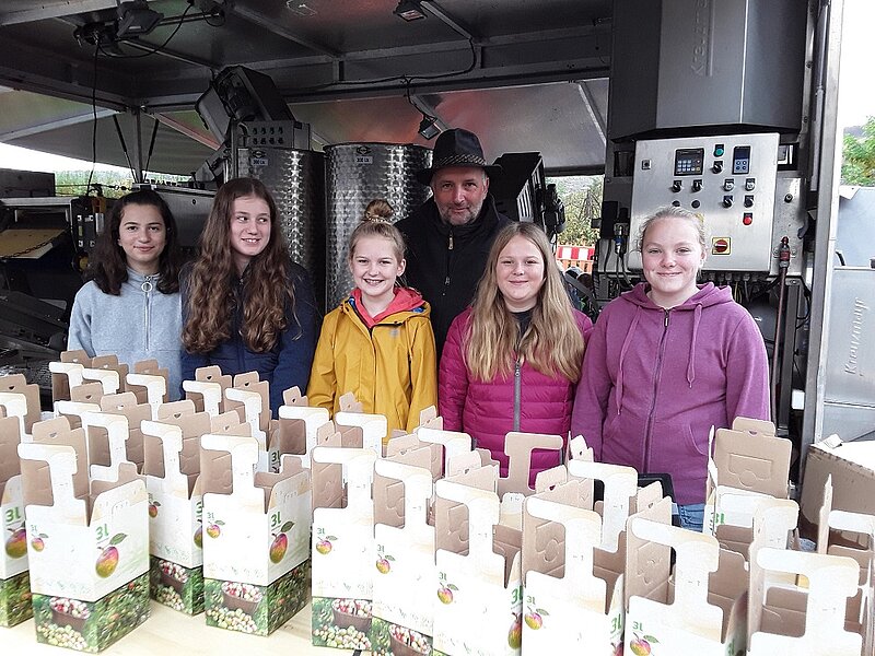 Nachdem der späte Frost im Mai die eigene Ernte auf der Streuobstwiese der Holderbergschule zunichte gemacht hatte, schaute sich die Projektleiterin der Naturparkschule, Janine Strycker, nach tragenden Bäumen um. Schließlich war die letztjährige Apfelsaftproduktion schon gänzlich in der Schulgemeinde verkauft oder bei Schulveranstaltungen ausgeschenkt worden. Nachschub des gesunden Saftes, mittlerweile schon ein Markenzeichen der Holderbergschule, musste her.