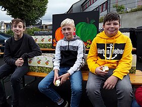 „Marthas Mobile Mosterei“ lief am vergangenen Mittwoch ab 9:30 Uhr nicht nur zur Freude der Holderbergschüler, sondern auch zum Staunen einiger Grundschüler und Kindergartenkinder, die eigens für dieses Spektakel vorbeigekommen waren. Mit großen Augen verfolgten sie, wie die Holderbergschüler die Äpfel auf das Förderband schütteten, den Waschvorgang des Obstes kontrollierten und den Trester auf einen, von der Familie Reeh aus Wissenbach extra hierfür bereitgestellten Anhänger, verteilten. Wenn dann der vorgefilterte, naturtrübe und auf 80 Grad erhitzte Saft in Beutel abgefüllt worden war, füllten die Erntehelfer diese nur noch in Kartons und stapelten diese auf Tischen und Bänken.