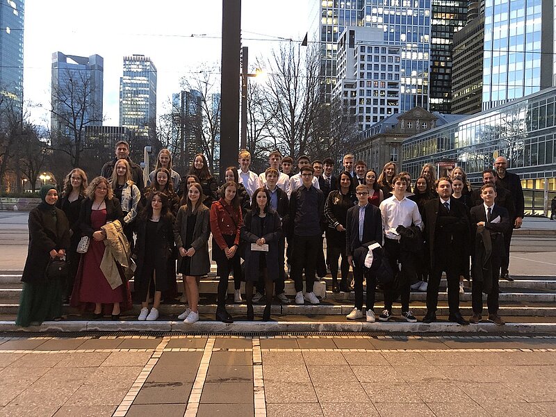 Der Besuch der Oper Frankfurt bildete den krönenden Abschluss des Unterrichtsthemas "Oper" für die Klassen 10G1 und 10G2. "Bei aller Beschäftigung mit dem Inhalt, dem Komponisten und den Figuren des Stückes muss man eine Oper einfach live erleben", so meint Patrick Zapf. Auch wenn Opern in der musikalischen Lebenswirklichkeit der Jugendlichen zumeist keine Rolle spielen, zeigten sich alle Schülerinnen und Schüler sowie die begleitenden Klassenlehrkräfte Carola Zapf und Oliver Thielmann sowie der Musiklehrer der Parallelklasse Steffen Runzheimer anschließend beeindruckt von der Inszenierung und dem Klang der Musik.