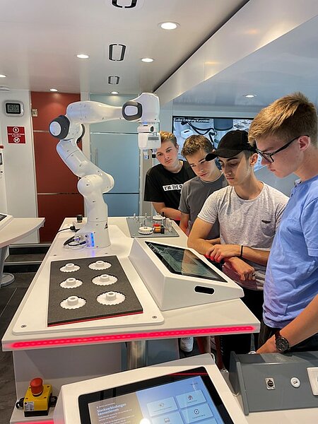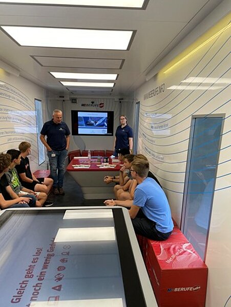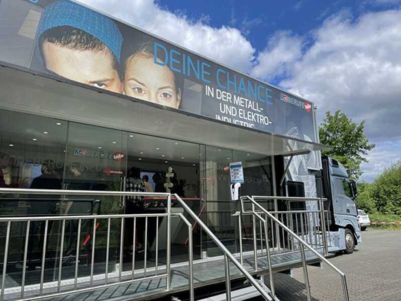 Am 14. und 15. Juli 2022 machte schließlich der Metall- und Elekto-Truck an der Holderbergschule einen Stopp und lud auf zwei Etagen mit insgesamt 80m² zur großen Entdeckungsreise durch die Berufe der Metall- und Elektro-Industrie ein und informierte über die Ausbildungs- und Berufsmöglichkeiten in dieser Branche. In der unteren Etage gelingt das besondere Erlebnis mit anschaulichen Mitmachstationen, an denen die Faszination Technik greifbar wird. Außerdem berichteten in Liveschaltungen junge Mitarbeitende, was ihnen an ihrem Arbeitsplatz wichtig ist und wie die Ausbildung abläuft. Der BerufeScout gibt auf einem riesigen Hochkant-Monitor Informationen zu den Berufen der Metall- und Elektro-Industrie. Wer noch nicht den passenden Beruf gefunden hat, kann dies hier spielerisch herausfinden - und findet auch direkt dazu passende freie Ausbildungsplätze in der Region.