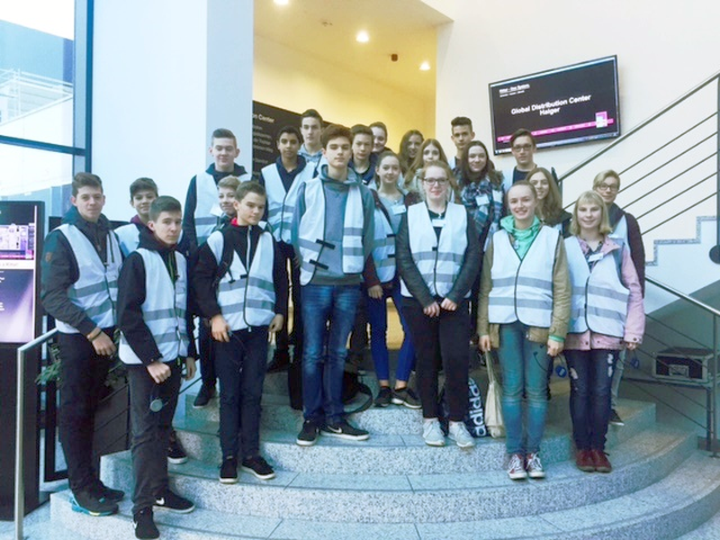 Die Schüler konnten sich ein Bild davon machen, wie in drei Schichten Lieferaufträge mithilfe des neuen, digitalen Logistiksystems in dem ruhigen und hellen Werk durch die Mitarbeiter bearbeitet werden. Aus den bis zu 32 Meter hohen und 90 Meter tiefen Regalreihen werden die geforderten Artikel voll automatisch über ein Transportband zum Packplatz transportiert. Auf einem Monitor wird der Auftrag detailliert angezeigt, so dass der Mitarbeiter die korrekte Abwicklung kontrollieren kann. Das Packen geschieht noch von Hand.
