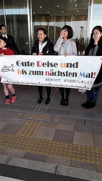 Nach dem elfstündigen Flug wurde die deutsche Besuchergruppe mit deutschen Flaggen von ihren Gastgebern empfangen. Angekommen in Shimotsuke, folgte eine kurze Empfangszeremonie, wonach die Gäste müde, aber glücklich mit ihren Gastfamilien nach Hause fuhren.
