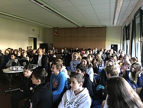 Nach der Begrüßung durch die Schulleiterin Andrea Rink startete der 90-minütige Vortrag über Japans Topologie, Kultur und Naturkatastrophen. Darüber hinaus bekamen die etwa 100 Schülerinnen und Schüler einen Einblick in den Schulalltag japanischer Jugendlicher. Mit viel Freude lernten die Holderbergschüler während des Vortrags sogar etwas japanisch! Sie können nun ihren Namen und ihr Wohlbefinden in der asiatischen Sprache ausdrücken. Dies wird vor allem den Teilnehmern des nächsten Japanisch-Deutschen-Schüleraustauschs von Nutzen sein, denn die Holderbergschule erwartet bereits im August 2020 Gäste aus der Dietzhölztaler Partnergemeinde Shimotsuke.