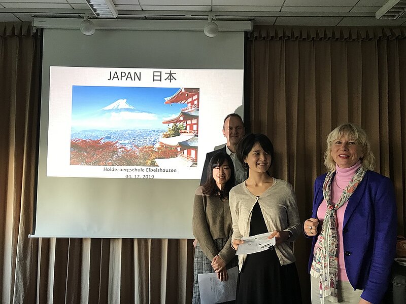 Viel Interesse zeigten die vier Klassen auch am Aufsatzwettbewerb zum Thema „Die Olympischen Spiele 2020 und ich“, bei dem die zehn Finalisten eine Einladung in die Residenz der japanischen Generalkonsulin in Frankfurt erhalten. Im letzten Jahr wurde einer damals zwölfjährigen Holderbergschülerin als mit Abstand jüngster Finalistin eine Siegerurkunde - zusammen mit weiteren Preisen - durch den Vizekonsul persönlich überreicht.