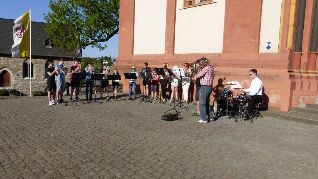 Auf der 25km Strecke ab Fürfurt bedienten die Schüler alle Schleusen selbst, entdeckten zahlreiche Wassertiere u.a. Bisam und Schildkröte und wurden Zeuge einer Schwanenpaarung. Nach der Mittagspause auf der Schleuseninsel BurgRunkel (Bild) ging´s mit neuer Strömung weiter bis Limburg. Hier gab die Brassband um 18:00 ihr Openair-Konzert direkt vor dem Dom. Ihr Programm war vielfältig: von Gospel über Choräle zu klassischer Musik und dann weiter in die Moderne: Bei King of the Road konnten die Zuhörer mitschnipsen. Fluch der Karibik und Titanic konnte dramatisch interpretiert werden, schließlich war die Brassband ohne Kenterung save an Land. Als Zugabe gab´s Afrika Medley, bei dem der Schlagzeuger Stefan Luther die Domstadt in den Dschungel versetzte. Alles in allem ein schöner und gelungener Tag für die Brassband.