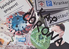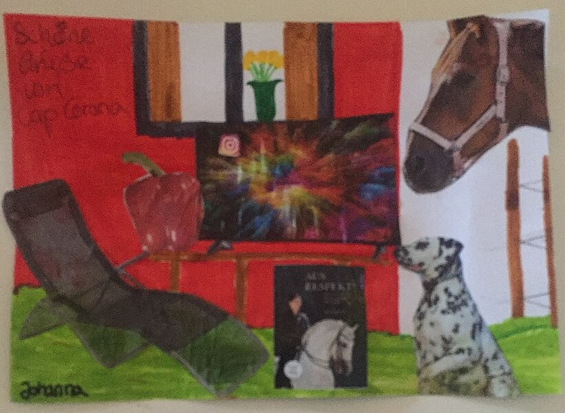 Die künstlerische Gestaltung bestand aus Collagen zum Thema „Corona“, einer selbst gebastelten Briefmarke auf Korkuntergrund und einer farbenfrohen Zeichnung der Freizeitaktivitäten: Hund, Pferd, Fernseher und Liegestuhl.