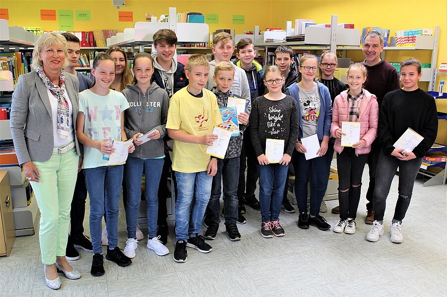 Die Siegerehrung durch die Schulleiterin Andrea Rink fand am 30. April in der Schulbibliothek statt. Allen Teilnehmern gratulierte sie zu ihren „großen Kängurusprüngen“ im Fach Mathematik. Die drei Schulsieger sind Finn Fritsch (7G1), Lukas Eva (5G1) und Lina Schmitt (6G1). In der Realschule erzielte Luca Weinert (7R1) das beste Ergebnis. Aus jedem Jahrgang wurden zudem die erfolgreichsten Teilnehmer geehrt. Das Känguru T-Shirt mit den „meisten richtigen Aufgaben am Stück“ eroberte sich in diesem Jahr Florian Eizenhöfer (6G2). Allen an dieser Stelle einen Herzlichen Glückwunsch!