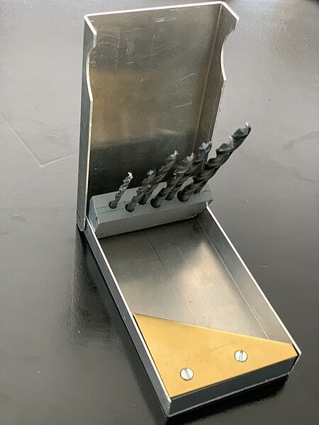 Dann folgte die praktische Arbeit mit dem Ziel, eine Bohrerkassette in Einzelarbeit zu fertigen, die dann jeder Schüler mitnehmen durfte. Dazu mussten die Kursteilnehmer viele elementare Arbeiten aus dem Bereich Metall erlernen: Kennzeichnen und Anreißen und von Bohrungen nach Zeichnungsvorgabe, Bearbeiten verschiedener Materialien (PVC, Aluminium, Messing), Kanten von Alu- und Messingbleche gemäß Zeichnung, Feilen von Kunststoffteilen auf Maß und Anbringen verschiedener Radien um Rundungen zu erstellen, Bohren und Montage von Bauteilen. Das Ergebnis, die fertige Bohrerkassette, konnte sich sehen lassen. Die Schüler fanden die Erfahrung gut und waren überrascht wie genau gearbeitet werden muss, damit alle Teile passgenau zusammengebaut werden können.