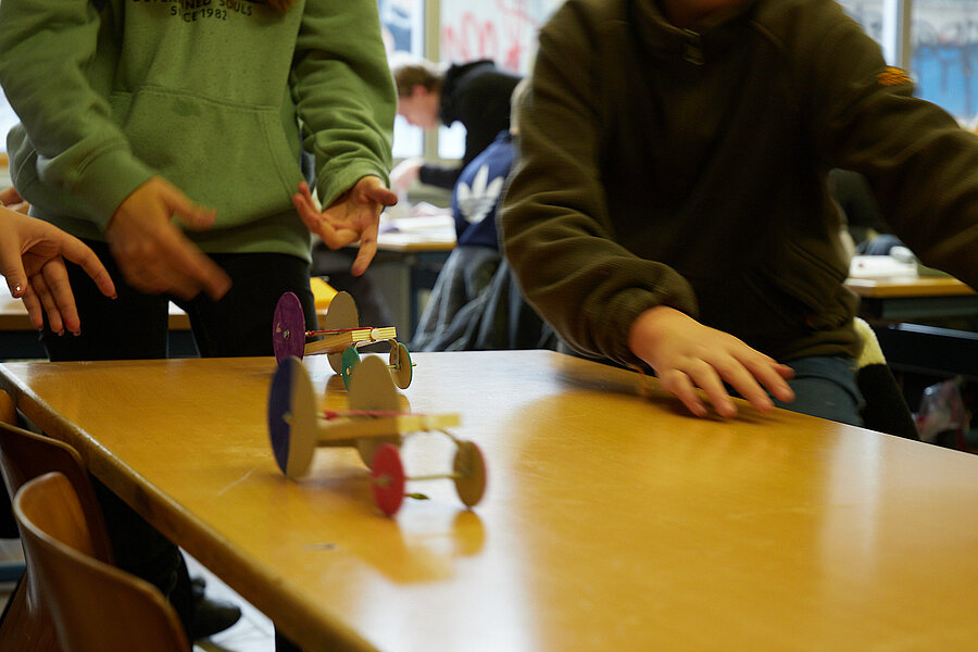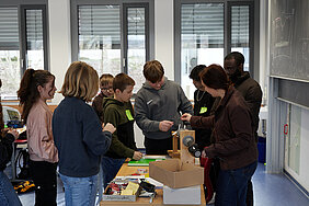 Nach einer Begüßung in der Schulmensa durch den neuen Schulleiter, Patrick Zapf, Ulrike Zenz von der Universität Siegen sowie Dr. Ulrich Kaltenbrunner als Schulkoordinator, gingen die Klassen des Jahrgangs 7 mit Begeisterung an die "Arbeit" und machten Versuche unter Anleitung von Wissenschaftsstudierenden der Universität Siegen zum Thema "Energieumwandlung". So wurde ein Modellauto gebastelt, in dem die Spannenergie eines Gummis in Bewegungsenergie umgewandelt wurde. In einem weiteren Modellversuch wurden Taschenwärmer hergestellt, indem Eisenpulver - vermischt mit Aktivkohle und Salzwasser - mit dem Luftsauerstoff reagiert. Das Ergebnis: Nach gründlichem Schütteln erreicht man teilweise Temperaturen von unglaublichen 90 °C. In einem weiteren Versuch wurde untersucht, wie viele Flügel und welche Flügelform ein Windrad haben muss um sich im Luftstrom besonders schnell zu drehen. Hierzu hatten die Studierenden extra ein Gebläse mitgebracht, welches die gebastelten Windräder - je nach individueller Bauform - mehr oder weniger schnell rotieren ließen. Hier galt es die optimale Bauform zu finden, einfach auszuprobieren und mit den Windrädern der Mitschüler zu vergleichen.
