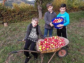 Bevor der letzte Erntehelfer nach Hause ging, wurden jedoch noch die schuleigenen Fünf-Liter-Boxen gezählt: 282 Stück! Das entspricht 1410 Liter gesundem Apfelsaft! Dieser wird nun in der Schulgemeinde verkauft, bei Schulveranstaltungen als Saft oder Punsch ausgeschenkt oder zu Gelee verarbeitet. Der Erlös fließt dann in weitere Projekte der „gesunden Schule“ oder in gemeinnützige Aktivitäten.