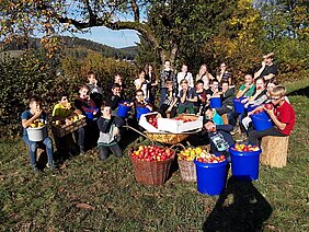 Tags zuvor hatten knapp 100 Schüler mit ihren Lehrern unter der Federführung der Projektleiterin Janine Strycker freudig die Klassenräume verlassen und somit Englisch, Deutsch und Mathe den Rücken zugewandt, um bei schönstem Herbstwetter den Lernort Streuobstwiese aufzusuchen. Während eine fünfte Klasse die Äpfel der schuleigenen Wiese aberntete, kümmerten sich Siebt- und Achtklässler um eine alte Streuobstwiese, die der Besitzer, ein Förderer der Holderbergschule, zur Verfügung gestellt hatte. Sein eigener Großvater hatte die Bäume selbst gepflanzt und damit über Jahrzehnte dafür gesorgt, dass der Keller das ganze Jahr mit Eingemachtem gefüllt war. Damals blieb kein Apfel am Baum hängen. Die Zeiten haben sich geändert und der Besitzer freut sich heute sehr, dass die Ernte so gut war und dass das Obst an der vor kurzem zur Naturparkschule zertifizierten Holderbergschule eine sinnvolle Verwendung gefunden hat.