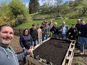 Zur feierlichen Eröffnung des neuen Hochbeets am 25.04.2025 versammelten sich zahlreiche Beteiligte: Bürgermeister Götz Konrad, Peter Luginbühl vom Bauhof, Schulleiter Patrick Zapf, UBUS-Kraft Tim Meyer, Lehrerin Sandra Becker, die Schülerinnen und Schüler des WP-Kurses „Schulgarten“ sowie Sven Gericke. Gemeinsam bestaunten sie das gelungene Projekt und würdigten das Engagement aller Beteiligten.