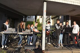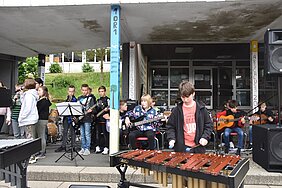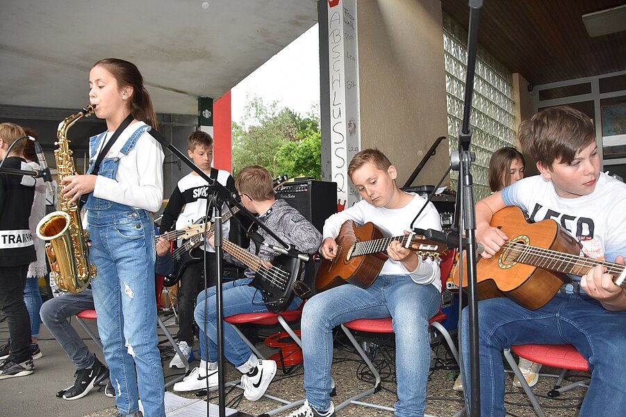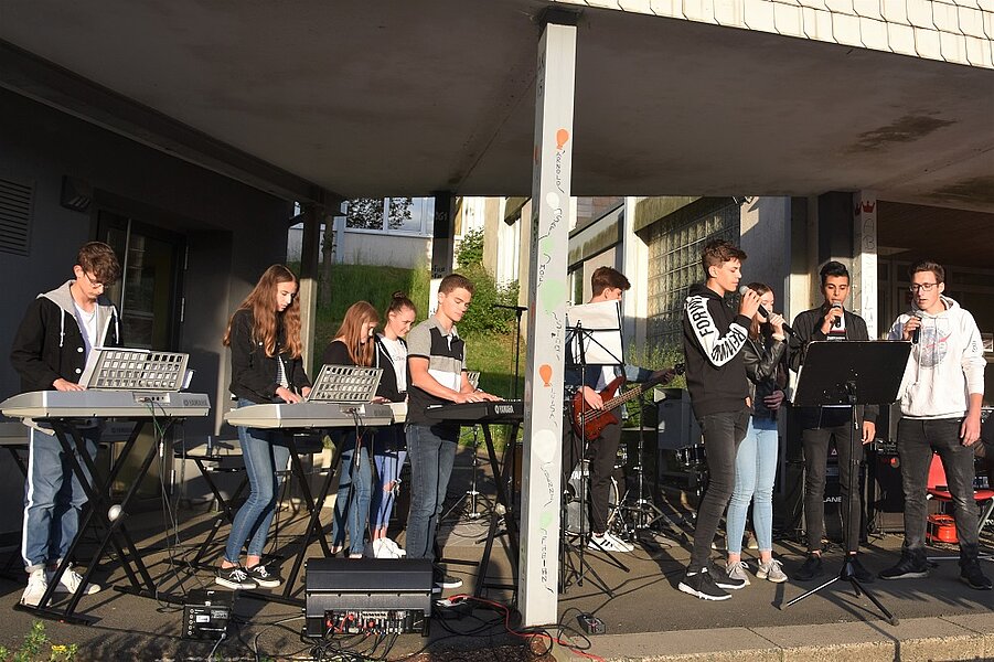 Unterschiedliche Ensembles aus diversen musikalischen Kursen trugen moderne Pop- und Rockmusikstücke vor. Die Bandklasse 7/8 unter der Leitung von Steffen Runzheimer präsentierte die Stücke „Shotgun‘ von George Ezra und „Let her Go“ von Passenger. Die Bandklasse 5, geleitet von Patrick Zapf, spielte die Stücke „80 Millionen“ von Max Giesinger, „Believer“ von den Imagine Dragons und „La Bamba“ von Richie Valens. Musiker der Klasse 10G2 verabschiedeten sich mit dem Stück „Zusammen“ von den Fantastischen 4. Der WP-Kurs “Big Band” spielte die Stücke „Something just like this“ (Chainsmokers und Coldplay), „Pumped up kicks“ (Foster the people) und „Counting stars“ (One Republic). Weitere Stücke wurden von der Schulband vorgetragen. Dennis Amend war mit der Technik-AG für den Auf- und Abbau zuständig. Für das leibliche Wohl sorgte die Klasse 10G1.