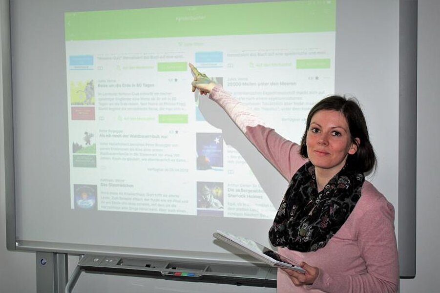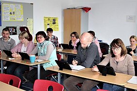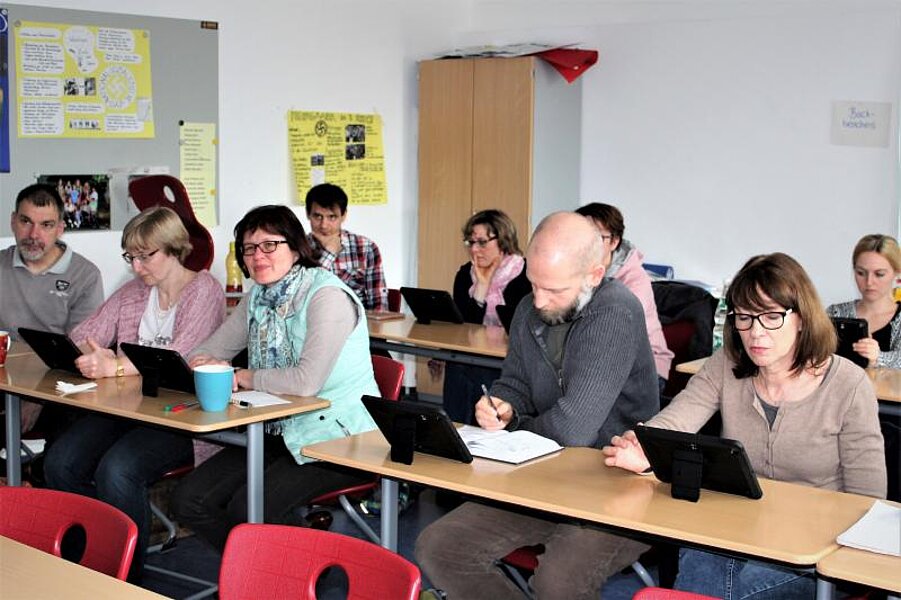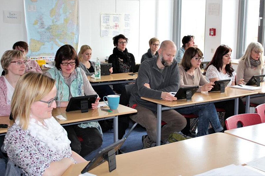 Nicole Sturm, medienpädagogische Beraterin des Lahn-Dill-Kreises und selbst Realschullehrerin in Herborn, leitete die informative und praxisnahe Fortbildung an der Holderbergschule, an der 16 Lehrerinnen und Lehrer teilnahmen. Nach einer kurzen, technischen Einführung folgte bereits die praxisbezogene Einführung in ausgewählte Apps. Äußerst sinnvoll ist beispielsweise, dass von jedem i-pad eine Verbindung zum Smartboard aufgebaut werden kann. So können Schülerarbeiten, die vorab auf den einzelnen Geräten oder zu Hause erstellt wurden, für alle sichtbar projiziert und besprochen werden. Von zentraler Bedeutung ist die Möglichkeit des eigenständigen Arbeitens an den einzelnen i-pads: Bei der Erarbeitung eines Themas oder einer Projektarbeit liegt die Entscheidung über Arbeitsschritte und Tempo - eventuell sogar die Auswahl an Materialien - bei den Nutzern. Dank des kreiseigenen Medienportals „IMeNS“, zu dem Schüler und Lehrer freien Zugang haben, stehen den Nutzern zusätzlich vielfältige und sichere Internetquellen zur Verfügung. So können alle Schülerinnen und Schüler weitgehend selbstständig arbeiten. Die Lehrkraft leistet während der Arbeitsphase Hilfestellung und übernimmt die Leitung in der Phase der Ergebnissicherung.