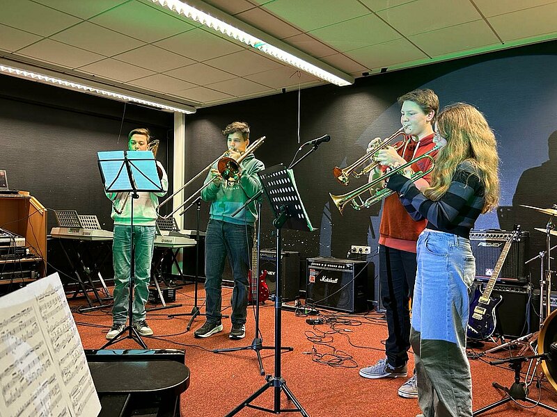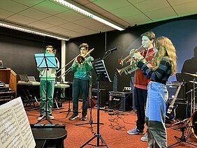 Bennet Schwehn (Klasse 6G1) spielte als jüngster Teilnehmer am E-Bass. Er glänzte mit je einem Stück von Metallica und den Red Hot Chilli Peppers. Umrahmt wurden die Teilnehmenden musikalisch durch das Blechbläserquartett der Holderbergschule, welches im vergangenen Jahr bereits einen ersten Platz im Wettbewerb erzielt hatte.