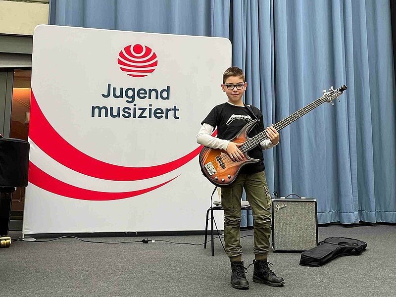 Bennet Schwehn trat am E-Bass in der Altersklasse 2 in der Musikschule Wiesbaden an und erreichte mit 24 von 25 Punkten einen sensationellen 1. Platz, verbunden mit der Weiterleitung zum Landeswettbewerb. Dieser wird am 17.3.24 in der Landesjugend Akademie in Schlitz durchgeführt. Als besondere Belohnung durfte Benett ferner beim Preisträgerkonzert am Freitag, den 15.2.24 in der Musikschule in Wiesbaden mitwirken.